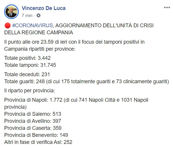 Questo quanto pubblicato sulla pagina facebook del Pres. De Luca:
