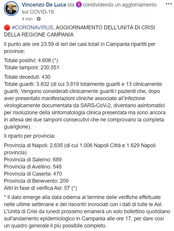 Questo quanto pubblicato sulla pagina facebook del Pres. Vincenzo De Luca.