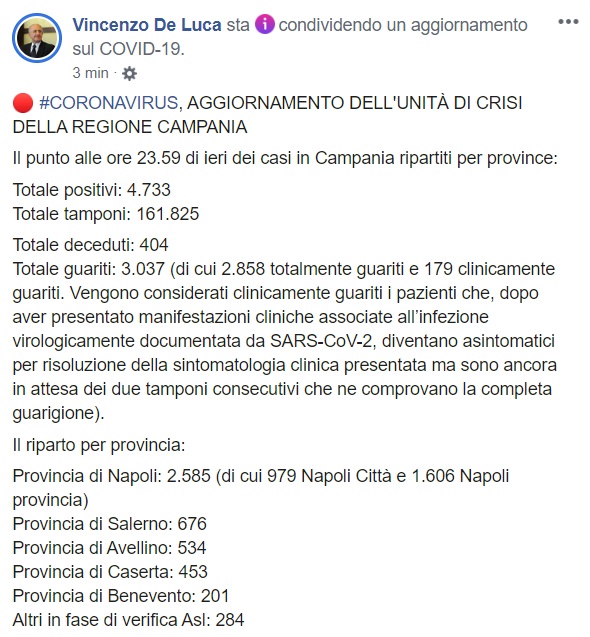 Questo quanto pubblicato sulla pagina facebook del Pres. Vincenzo De Luca: