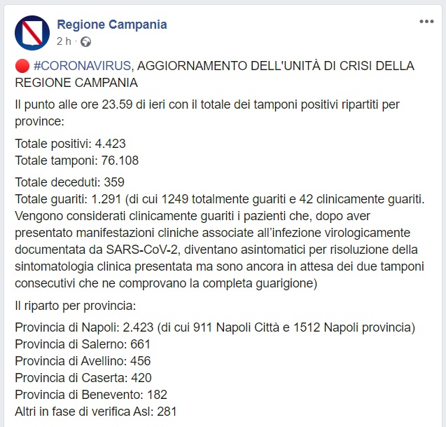 Questo quanto comunicato dalla Regione Campania