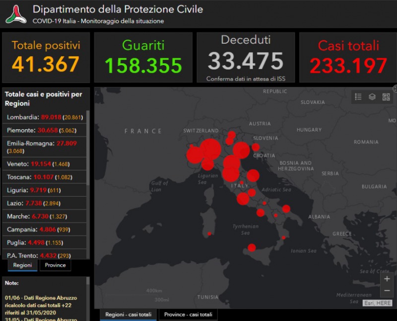Continua trend generale in discesa dei nuovi positivi. È quanto si rileva dai dati del monitoraggio sanitario sulla diffusione del nuovo coronavirus diffusi alle 18 del 1 giugno. L’incremento dei nuovi positivi è pari a 178. Complessivamente i casi dall'inizio dell’emergenza sono 233.197, così divisi: