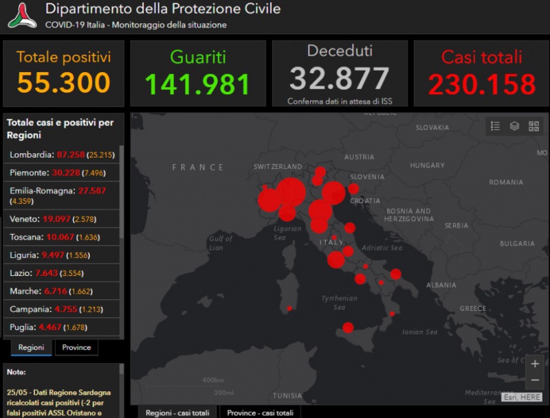 rend generale dei nuovi positivi in discesa e lieve calo dei decessi. È quanto si rileva dai dati del monitoraggio sanitario sulla diffusione del nuovo coronavirus diffusi alle 18 del 25 maggio. -Si legge nella nota- L’incremento dei nuovi positivi è pari a 300. Complessivamente i casi dall'inizio dell’emergenza sono 230.158, così divisi: