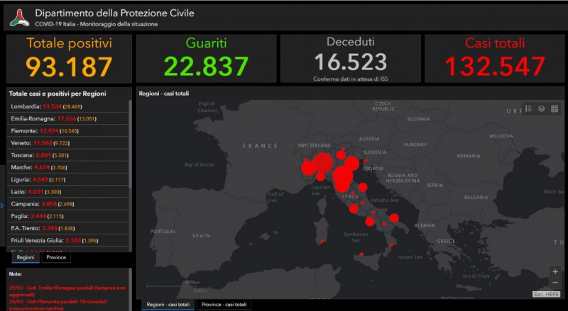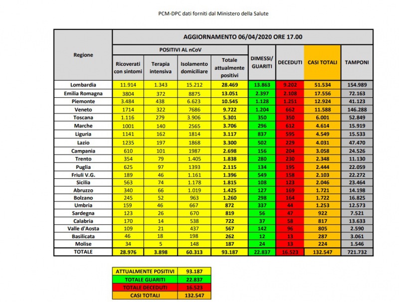 Questi i dati emanati dalla Protezione Civile in merito al contagio da Coronavirus in Italia. Gli attualmente positivi sono 93.187, che portano a un totale di casi di 132.547. I dimessi guariti sono 22.837 guariti e i deceduti sono 16.523 (in attesa di conferma dell'I.S.S.).