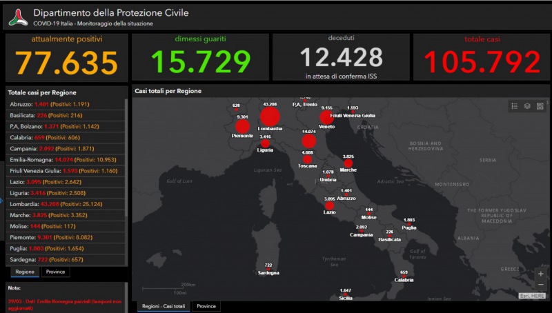 La Port. Civile ha diramato gli ultimi dati in merito al contagio da Coronavirus. Attualmente in Italia si contano 77.635 contagiati, per un totale di 105.792 dall'inizio dell'epidemia. Di questi 15.729 sono guariti e 12.428 (in attesa di conferma dall'I.S.S.) i deceduti.