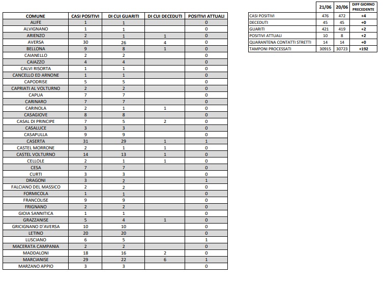 AGG. CORONAVIRUS in Prov. di CE 22/06. Nuovi 2 casi di contagio registrati
