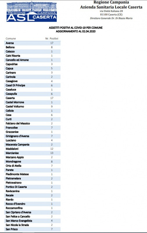 Questo il quotidiano aggiornamento dei dati del contagio da Coronavirus da parte dell'ASL Caserta in Provincia, suddiviso Comune per Comune. Lo apprendiamo dal sito Asl Caserta.it: