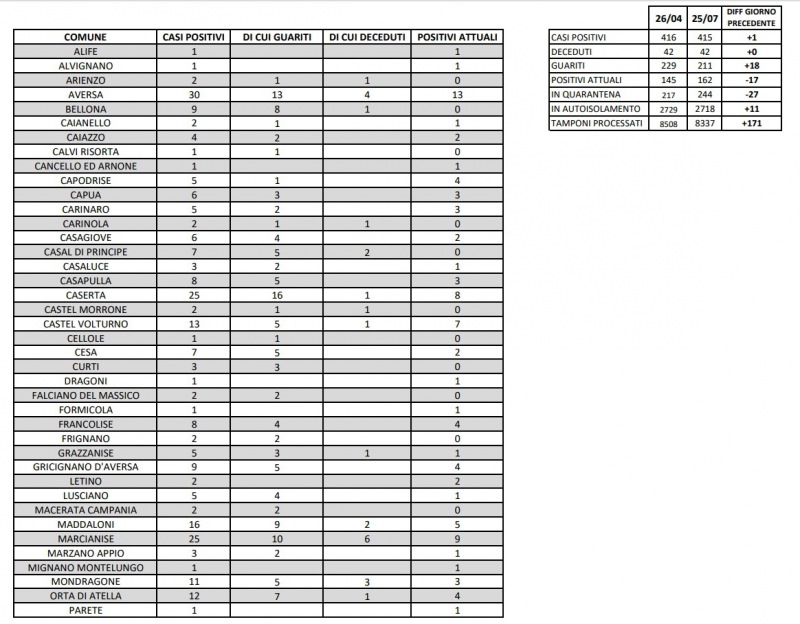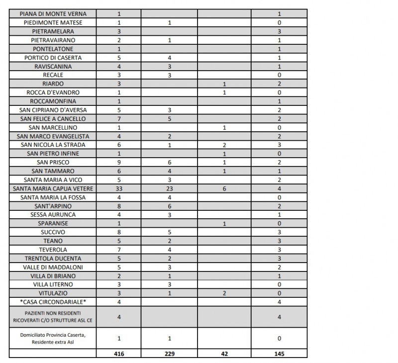 Questi i dati pubblicati dall'Asl di Caserta: