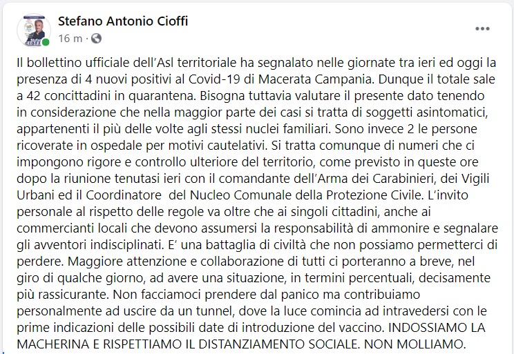 Questo quanto comunicato dalla pagina FB del Sindaco di Macerata Campania