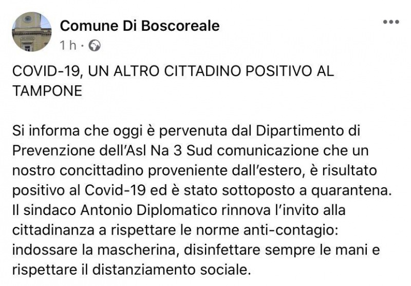 Questo quanto comunicato dal Comune di Boscoreale