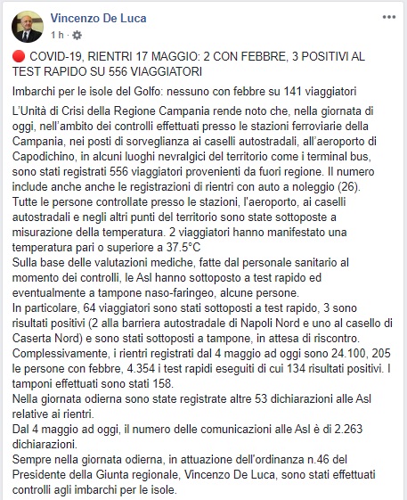 Agg. Coronavirus. Rientri 17/05. De Luca: "Su 556 viaggiatori 2 con febbre e 3 positivi al test rapido"
