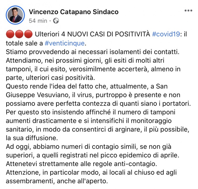 Agg. Coronavirus S.G.Vesuviano. Catapano: "4 nuovi casi. Il virus è presente"