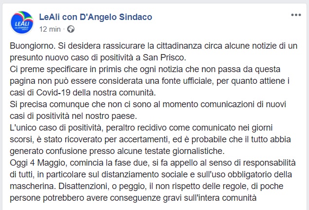 Questo quanto apprendiamo dalla pagina fb del Sindaco di San Prisco