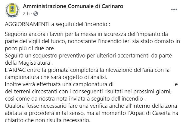 "AGGIORNAMENTI a seguito dell’incendio : Seguono ancora i lavori per la messa in sicurezza dell’impianto da parte dei vigili del fuoco, nonostante l’incendio ieri sia stato domato in poco più di due ore. Seguirà un sequestro preventivo per ulteriori accertamenti da parte della Magistratura . -Si legge nella nota- L’ARPAC entro la giornata completerà la rilevazione dell’aria con la campionatura che sarà oggetto di analisi. Inoltre verrà effettuata una campionatura di ... e dei terreni circostanti con i conseguenti risultati nei prossimi giorni, così come da nostra nota inviata a seguito dell’incendio . -Si legge nella nota- Qualora fosse necessario fare una verifica anche all’interno della zona abitata si procederà in tal senso, ma al momento l’Arpac di Caserta ha chiarito che non risulta necessario."