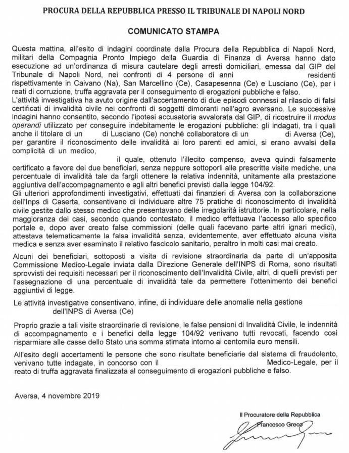 Pubblichiamo parte della nota stampa della Procura della Repubblica di Napoli Nord