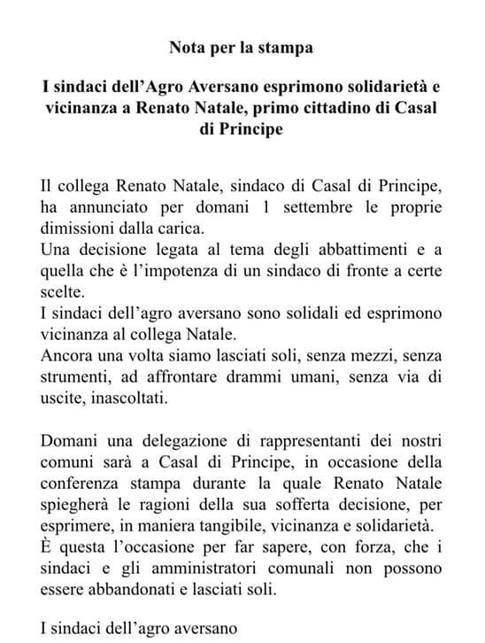 Il collega Renato Natale, sindaco di Casal di Principe, ha annunciato per domani 1 settembre le proprie dimissioni dalla carica (clicca qui). Una decisione legata al tema degli abbattimenti e a quella che è l’impotenza di un sindaco di fronte a certe scelte. I sindaci dell’agro aversano sono solidali ed esprimono vicinanza al collega Natale. Ancora una volta siamo lasciati soli, senza mezzi, senza strumenti, ad affrontare drammi umani, senza via di uscite, inascoltati ... Domani una delegazione di rappresentanti dei nostri comuni sarà a Casal di Principe, in occasione della conferenza stampa durante la quale Renato Natale spiegherà le ragioni della sua sofferta decisione, per esprimere, in maniera tangibile, vicinanza e solidarietà. È questa l’occasione per far sapere, con forza, che i sindaci e gli amministratori comunali non possono essere abbandonati e lasciati soli. I sindaci dell’agro aversano."
