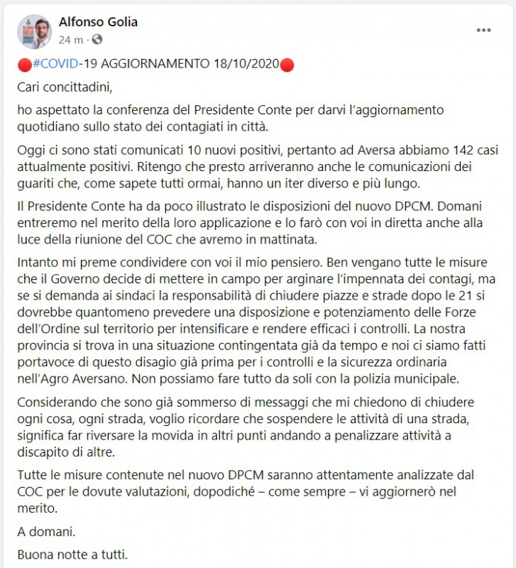 Questo quanto pubblicato sulla pagina FB del Sindaco di Aversa