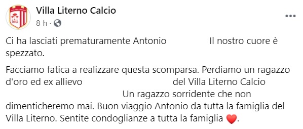 Questo il messaggio di cordoglio che apprendiamo dalla pagina facebook del Villa Literno Calcio: "Ci ha lasciati prematuramente Antonio ... Il nostro cuore è spezzato. Facciamo fatica a realizzare questa scomparsa. Perdiamo un ragazzo d'oro ed ex allievo ... del Villa Literno Calcio che ha fatto tutta la trafila con noi. Un ragazzo sorridente che non dimenticheremo mai. Buon viaggio Antonio da tutta la famiglia del Villa Literno. Sentite condoglianze a tutta la famiglia".