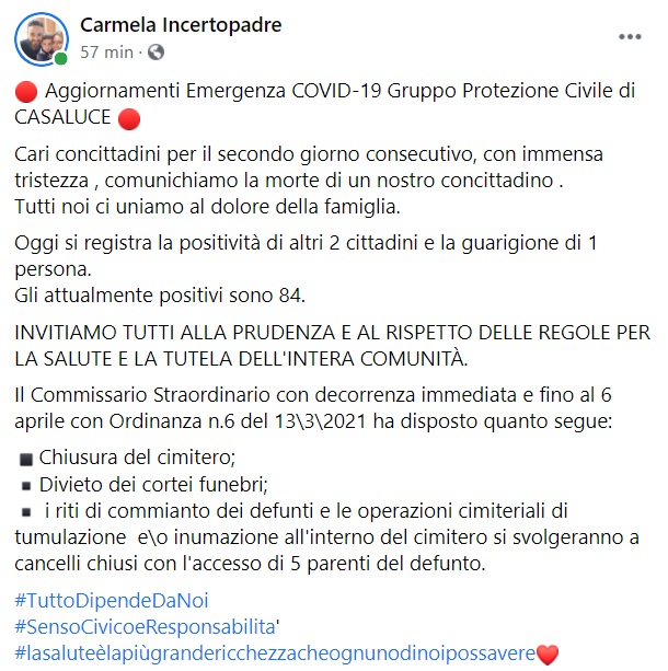 "Aggiornamenti Emergenza COVID-19 Gruppo Protezione Civile di CASALUCE. Cari concittadini per il secondo giorno consecutivo, con immensa tristezza , comunichiamo la morte di un nostro concittadino . Tutti noi ci uniamo al dolore della famiglia. Oggi- si legge nella nota- si registra la positività di altri 2 cittadini e la guarigione di 1 persona. Gli attualmente positivi sono 84. INVITIAMO TUTTI ALLA PRUDENZA E AL RISPETTO DELLE REGOLE PER LA SALUTE E LA TUTELA DELL'INTERA COMUNITÀ. Il Commissario Straordinario con decorrenza immediata e fino al 6 aprile con Ordinanza n.6 del 1332021 ha disposto quanto segue: Chiusura del cimitero; Divieto dei cortei funebri; i riti di commianto dei defunti e le operazioni cimiteriali di tumulazione eo inumazione all'interno del cimitero si svolgeranno- si legge nella nota- a cancelli chiusi con l'accesso di 5 parenti del defunto."