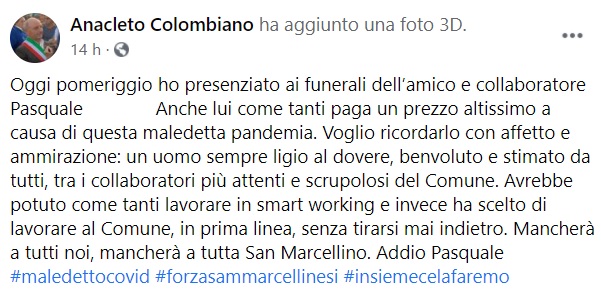 "Oggi pomeriggio ho presenziato ai funerali dell’amico e collaboratore Pasquale ... Anche lui come tanti paga un prezzo altissimo a causa di questa maledetta pandemia. Voglio ricordarlo- si legge nella nota- con affetto e ammirazione: un uomo sempre ligio al dovere, benvoluto e stimato da tutti, tra i collaboratori più attenti e scrupolosi del Comune. Avrebbe potuto come tanti lavorare in smart working e invece ha scelto di lavorare al Comune, in prima linea, senza tirarsi mai indietro. Mancherà- si legge nella nota- a tutti noi, mancherà a tutta San Marcellino. Addio Pasquale"