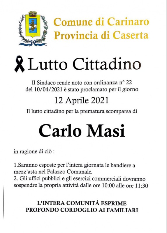 In seguito alla scomparsa di Carlo Masi l'amministrazione comunale di Carinaro ha indetto il lutto cittadino per il prossimo 12 aprile con ordinanza n. 22 pubblicata oggi.