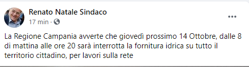 Questo il post pubblicato sulla sua pagina Facebook dal Sindaco di Casal di Principe Renato Natale: "La Regione Campania avverte che giovedì prossimo 14 Ottobre, dalle 8 di mattina alle ore 20 sarà interrotta la fornitura idrica su tutto il territorio cittadino, per lavori sulla rete. Oltre Casal di Principe - si legge nel post - i Comuni interessati all'interruzione della fornitura idrica sono: Gricignano, Carinaro, Teverola, Casaluce, Frignano, S.Marcellino, Villa di Briano, Casapesenna, S.Cipriano e Villa Literno".