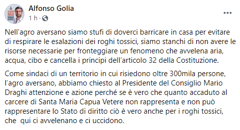 Questo parte del post pubblicato sulla sua pagina Facebook dal Sindaco di Aversa Alfonso Golia: "Nell’agro aversano siamo stufi di doverci barricare in casa per evitare di respirare le esalazioni dei roghi tossici, siamo stanchi di non avere le risorse necessarie per fronteggiare un fenomeno che avvelena aria, acqua, cibo e cancella - si legge nel post - i principi dell’articolo 32 della Costituzione.