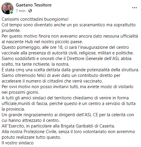Per ovvi motivi non posso invitarvi tutti, ma avrete modo di visitarlo nei prossimi giorni. A tutti gli amici sindaci del territorio chiediamo di venire in forma ufficiale,muniti di fascia, perché questo è un centro a servizio di tutta la provincia. Un grande ringraziamento ai dirigenti dell'ASL CE per la celerità con cui hanno attrezzato il centro. All''Esercito - prosegue il post - in particolare alla Brigata Garibaldi di Caserta. Alla nostra Protezione Civile, senza il loro volontariato non avremmo potuto realizzare tutto questo. Il vostro sindaco".