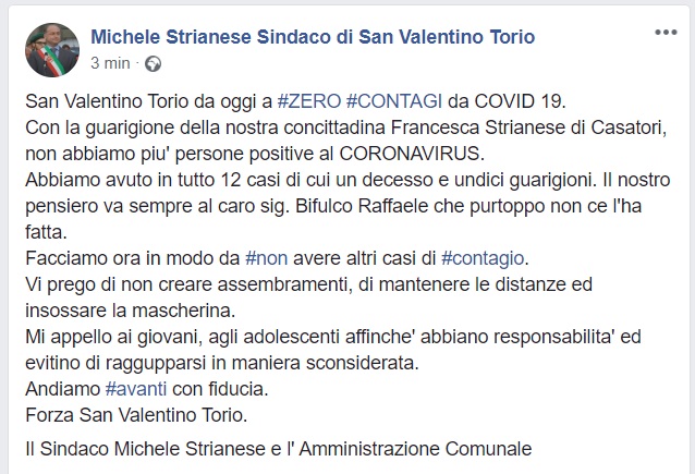 Questo quanto pubblicato sulla propria pagina facebook dal Sindaco Michele Strianese