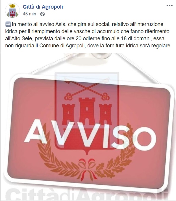 Questo quanto apprendiamo dalla pagina facebook del Comune di Agropoli: