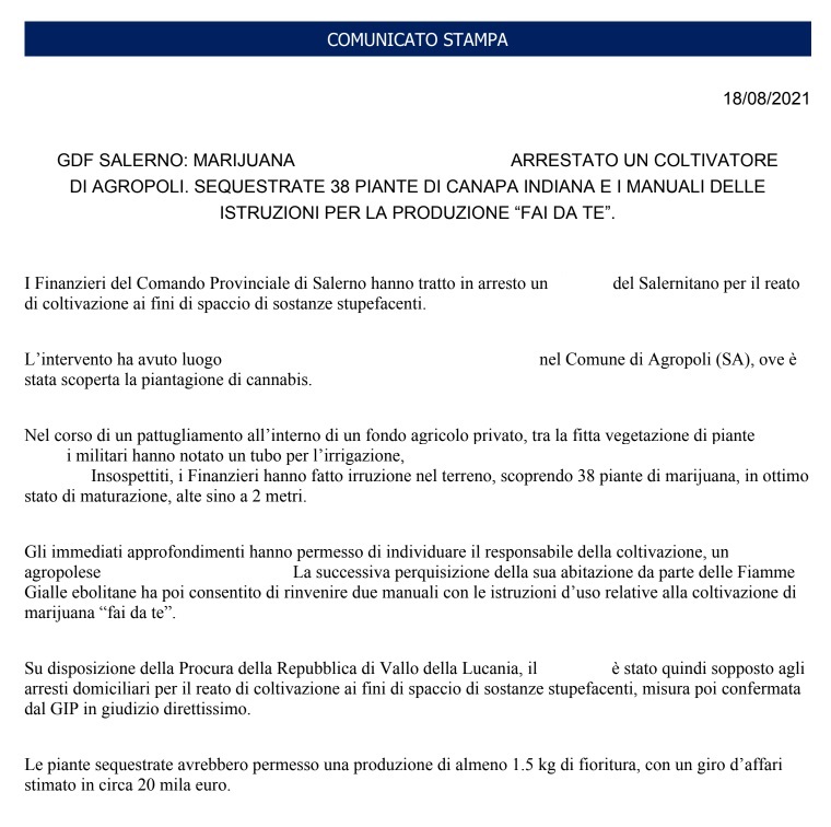 Pubblichiamo COMUNICATO STAMPA GUARDIA DI FINANZA Comando Provinciale Salerno: "GDF SALERNO: MARIJUANA ... ARRESTATO UN COLTIVATORE DI AGROPOLI. SEQUESTRATE 38 PIANTE DI CANAPA INDIANA E I MANUALI DELLE ISTRUZIONI PER LA PRODUZIONE “FAI DA TE”.