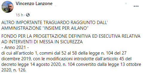 Questa parte del post pubblicato dal Sindaco di Ailano Vincenzo Lanzone: "Altro importante traguardo raggiunto dall'amministrazioone 'Insieme per Ailano'. Fondo per la progettazione definitiva ed esecutiva relativa ad interventi di messa in sicurezza Anno 2021 - si legge nel post - di cui all'articolo 1, commi dal 52 al 58 della legge n. 104 del 27 dicembre 2019, con le modificazioni introdotte dall’articolo 45 del decreto legge 14 agosto 2020, n. 104 convertito dalla legge 13 ottobre 2020, n. 126 (...)".