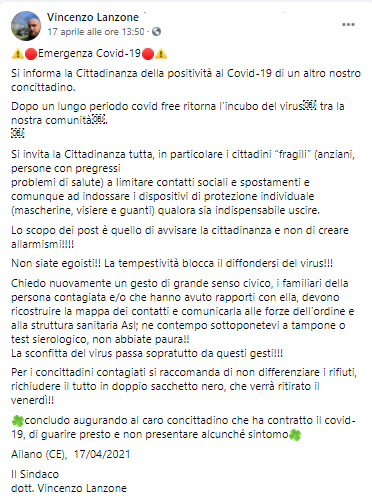 Questo il post pubblicato dal Sindaco di Ailano Vincenzo Lanzone sulla sua pagina Facebook: "Emergenza Covid-19. Si informa la Cittadinanza della positività al Covid-19 di un altro nostro concittadino. Dopo un lungo periodo covid free ritorna l’incubo del virus tra la nostra comunità. Si invita la Cittadinanza tutta - prosegue il Sinadco - in particolare i cittadini “fragili” (anziani, persone con pregressi problemi di salute) a Iimitare contatti sociali e spostamenti e comunque ad indossare i dispositivi di protezione individuale (mascherine, visiere e guanti) qualora sia indispensabile uscire. Lo scopo dei post è quello di avvisare la cittadinanza e non di creare allarmismi!!!! Non siate egoisti!! La tempestività blocca il diffondersi del virus!!! Chiedo - prosegue il post - nuovamente un gesto di grande senso civico, i familiari della persona contagiata e/o che hanno avuto rapporti con ella, devono ricostruire la mappa dei contatti e comunicarla alle forze dell’ordine e alla struttura sanitaria Asl; ne contempo sottoponetevi a tampone o test sierologico, non abbiate paura!! La sconfitta del virus passa sopratutto da questi gesti!!! Per i concittadini contagiati si raccomanda di non differenziare i rifiuti, richiudere il tutto in doppio sacchetto nero, che verrà ritirato il venerdì!! Concludo - si legge nel post - augurando al caro concittadino che ha contratto il covid-19, di guarire presto e non presentare alcunché sintomo. Ailano (CE), 17/04/2021 Il Sindaco dott. Vincenzo Lanzone".