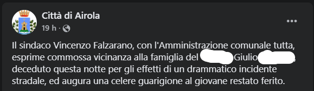 Un grave incidente si e' verificato nel Sannio tra Airola e Arpaia nella notte tra venerdì e sabato dove un giovane di Santa Maria a Vico ha perso la vita. Nel pomeriggio di ieri, l'amministrazione comunale di Airola ha pubblicato il seguente post di cordoglio sulla sua pagina Facebook.