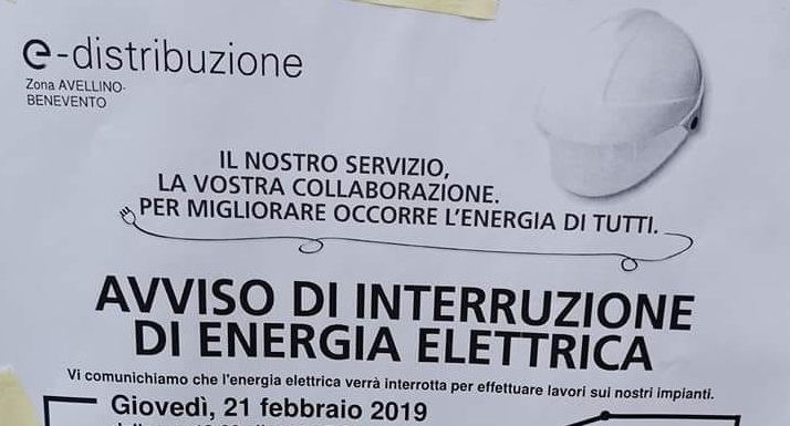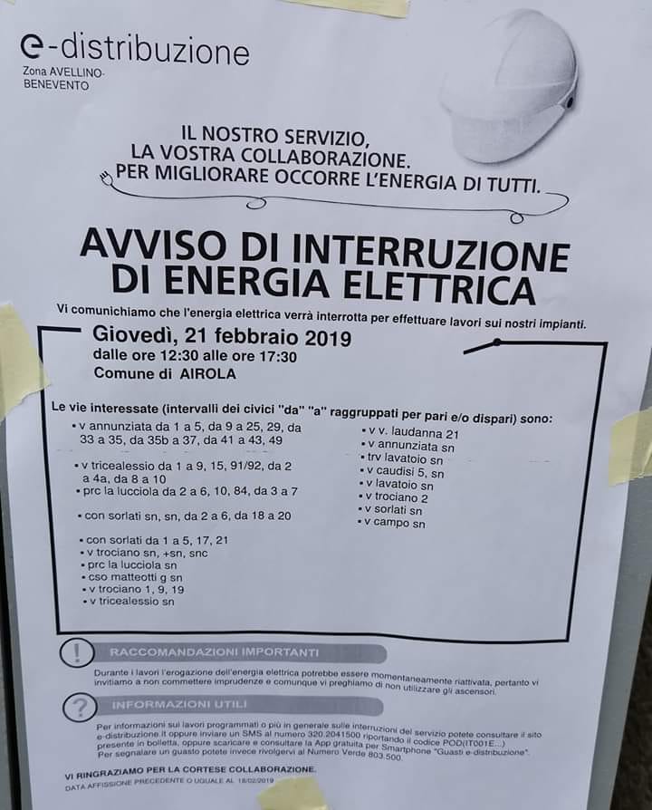 "ATTENZIONE. INTERRUZIONE ENERGIA ELETTRICA. Giovedi 21 stop dalle 12:30 alle 17:30. Le zone interessate".