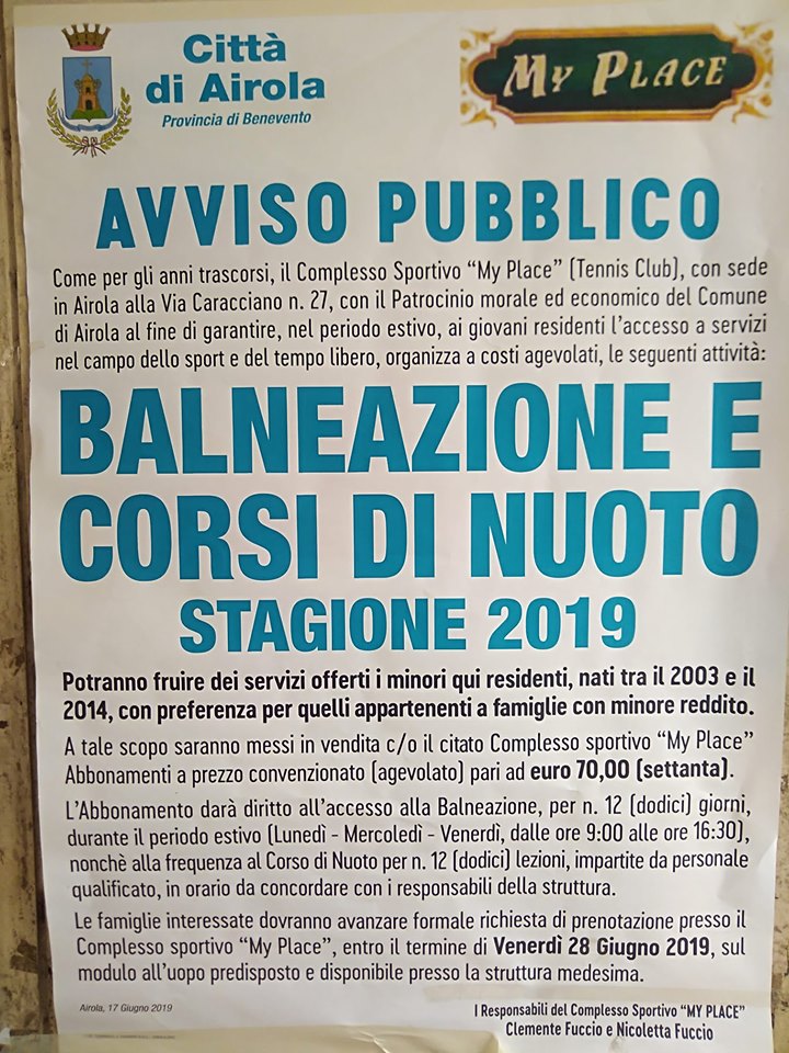 Il Complesso Sportivo "My Place" (Tennis Club), con il patrocinio morale ed economico del Comune di Airola, organizza per la stagione estiva accesso alla balneazione e corsi di nuoto per i nati tra il 2003 e il 2014 residenti in città. Il tutto è usufruibile con un abbonamento al prezzo convenzionato di 70,00 euro che consente la balneazione per 12 giorni e 12 lezioni di nuoto. Tutte le persone interessate devono fare richiesta al centro sportivo "My Place" entro il 28 giugno 2019.