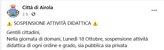 Questo il post pubblicato sulla pagina Facebook della Città di Airola: "Gentili cittadini, Nella giornata di domani, Lunedì 18 Ottobre - recita il post - sospensione attività didattica di ogni ordine e grado, sia pubblica sia privata".