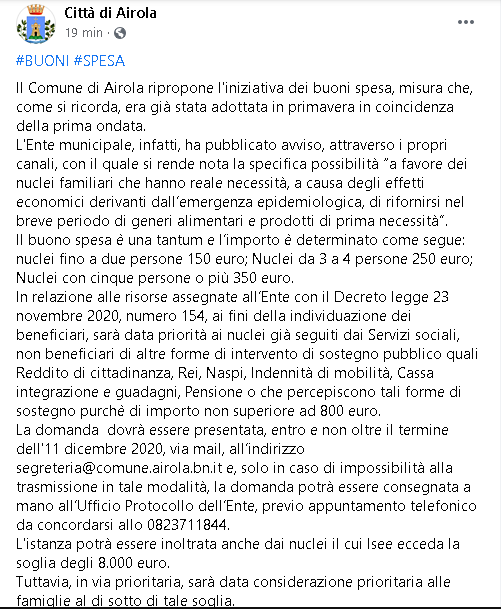 Lo apprendiamo dalla pagina Facebook Città di Airola.
