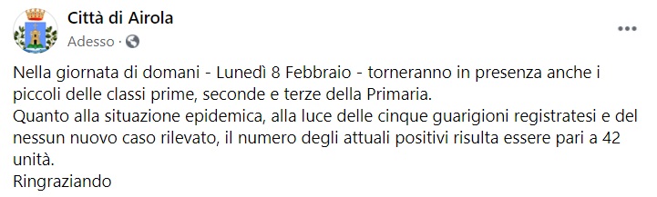 "Nella giornata di domani - Lunedì 8 Febbraio - torneranno in presenza anche i piccoli delle classi prime, seconde e terze della Primaria. Quanto alla situazione epidemica, alla luce delle cinque guarigioni registratesi- si legge nella nota- e del nessun nuovo caso rilevato, il numero degli attuali positivi risulta essere pari a 42 unità. Ringraziando"