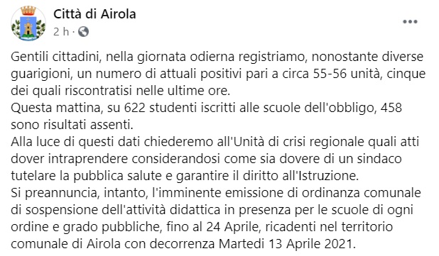 "Gentili cittadini, nella giornata odierna registriamo, nonostante diverse guarigioni, un numero di attuali positivi pari a circa 55-56 unità, cinque dei quali riscontratisi nelle ultime ore. Questa mattina, su 622 studenti iscritti alle scuole dell'obbligo, 458 sono risultati assenti. -Si legge nella nota- Alla luce di questi dati chiederemo all'Unità di crisi regionale quali atti dover intraprendere considerandosi come sia dovere di un sindaco tutelare la pubblica salute e garantire il diritto all'Istruzione. -Si legge nella nota- Si preannuncia, intanto, l'imminente emissione di ordinanza comunale di sospensione dell'attività didattica in presenza per le scuole di ogni ordine e grado pubbliche, fino al 24 Aprile, ricadenti nel territorio comunale di Airola con decorrenza Martedi 13 Aprile 2021."
