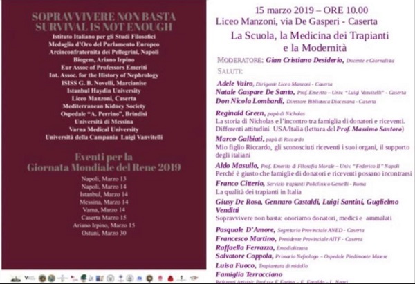 "Ritorna l’ormai consueto appuntamento con la rassegna “Survival is not Enough” (Sopravvivere non basta), che già da diversi anni, in occasione della Giornata Mondiale del Rene, vede diverse realtà istituzionali e sigle associative dell’Europa Mediterranea confrontarsi sulle problematiche cliniche, tecniche e sociali relative alla malattia renale cronica. La rete che da anni porta avanti sul territorio la rassegna “Sopravvivere non basta” rappresentata dall’Istituto Italiano per gli Studi Filosofici, con il Prof. Emerito Natale Gaspare De Santo, l’Università della Campania “Luigi Vanvitelli” ed il Liceo Manzoni di Caserta, diretto dalla dirigente scolastica-spiega la nota- , Adele Vairo, quest’anno discute il recente parere del Comitato Nazionale di Bioetica sulla possibilità che le famiglie donatrici si incontrino con coloro che hanno ricevuto gli organi dei loro congiunti. Una possibilità che è stata sostenuta negli anni dai filosofi Aldo Masullo, Remo Bodei e dal Presidente emerito della Corte Costituzionale Professor Francesco Paolo Casavola. L’iniziativa è prevista per Venerdì 15 Marzo presso il Liceo Manzoni (ore 10:00), sito in Via De Gasperi a Caserta: in questa occasione, gli ospiti saranno il Prof Aldo Masullo, emerito di Filosofia Morale Università Federico II di Napoli, il Chirurgo dei trapianti Franco Citterio del Gemelli di Roma, Marco Galbiati, industriale lombardo che ha avviato una “battaglia” per modificare parzialmente la legge che prevede l’anonimato dei donatori di organi e l’impossibilità,-spiega la nota- per i familiari di chi ha donato, di conoscere chi ne ha beneficiato, lanciando l’iniziativa sulla piattaforma internazionale Change.org. L’uomo, di Lecco, ha dovuto affrontare la stessa decisione nel gennaio dello scorso anno, quando un malore uccise il figlio Riccardo, 15 anni, mentre si godeva una giornata sulle nevi di Aprica. A sostenerlo iI giornalista americano Reginald Green, a cui uccisero il figlio Nicholas sull'autostrada Salerno-Reggio Calabria e i cui organi salvarono 7 persone.-conclude la nota- A conclusione dell’evento, i due generosi papà, presenzieranno all’intitolazione di un albero, del giardino del Liceo Manzoni, alla memoria dei due giovani” Nicholas Green e Riccardo Galbiati, donatori di vita”. Modererà il giornalista Giancristiano Desiderio."