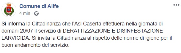 Questo quanto apprendiamo dalla pagina facebook del Comune di Alife: