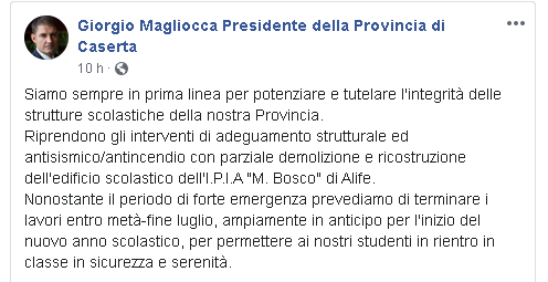 Lo apprendiamo dalla pagina Facebook del Presidente della Provincia di Caserta, Giorgio Magliocca: