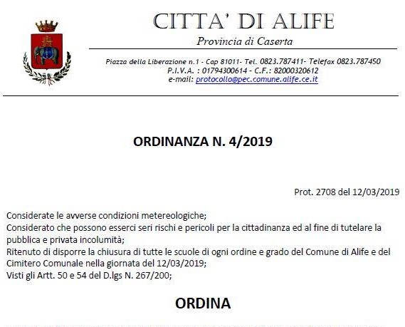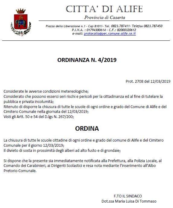 "ORDINANZA N° 4 CHIUSURA SCUOLE E CIMITERO COMUNALE".