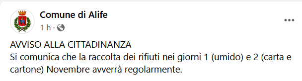 Questo il post pubblicato sulla pagina Facebook del Comune di Alife: "Si comunica che la raccolta dei rifiuti nei giorni 1 (umido) e 2 (carta e cartone) Novembre avverrà regolarmente - conclude il post".