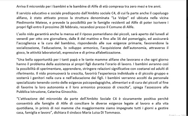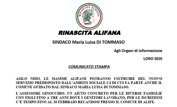 Questo il comunicato inviatoci dall'Ufficio Stampa del Sindaco di Alife Maria Luisa Di Tommaso.