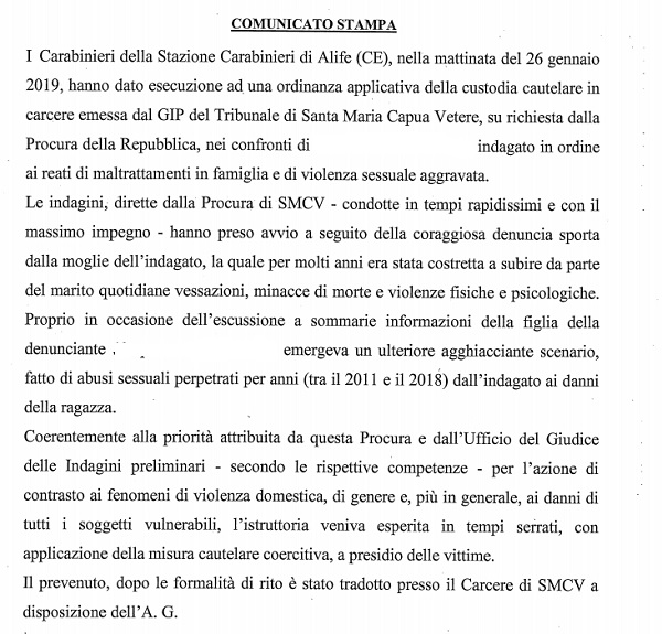 PUBBLICHIAMO LA NOTA DEI CARABINIERI GIUNTA IN REDAZIONE: