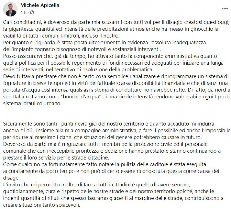Questo quanto apprendiamo dalla pagina fb del Sindaco Apicella: "Cari concittadini, è doveroso da parte mia scusarmi con tutti voi per il disagio creatosi quest’oggi; la gigantesca quantità ed intensità delle precipitazioni atmosferiche ha messo in ginocchio la viabilità di tutti i comuni limitrofi, incluso il nostro. Per quanto ci riguarda, è stata posta ulteriormente in evidenza l’assoluta inadeguatezza - si legge nella nota - dell’impianto fognario bisognoso di notevoli e sostanziali interventi. Posso assicurarvi che, già da tempo, ho attivato tanto la componente amministrativa quanto quella politica per il possibile reperimento di fondi necessari ed adeguati per iniziare una lunga serie di interventi, nel tentativo di risoluzione della problematica. Devo tuttavia precisare che non è certo cosa semplice rianalizzare e riprogrammare un sistema di fognature in breve tempo ed in virtù dell’attuale scarsa disponibilità finanziaria e che dinanzi una portata d’acqua così intensa qualsiasi sistema di condutture non avrebbe retto. Di fatto, da nord a sud Italia notiamo come “bombe d’acqua” - si legge nella nota - di una simile intensità rendono vulnerabile ogni tipo di sistema idraulico urbano. ... Sicuramente sono tanti i punti nevralgici del nostro territorio e quanto accaduto mi indurrà ancora di più, insieme alla mia compagine amministrativa, a fare il possibile ed anche l’impossibile per ridurre al massimo i danni che situazioni del genere potrebbero causare in futuro. Doveroso da parte mia è ringraziare tutti i membri della protezione civile ed il personale comunale che con ineccepibile prontezza e dedizione hanno prestato e stanno continuando a prestare il loro servizio per le strade cittadine. Come qualcuno ha fortunatamente fatto notare la pulizia delle caditoie è stata eseguita accuratamente da poco tempo e non può di certo essere riconosciuta questa come causa dei disagi. L’invito che mi permetto inoltre di fare - si legge nella nota - a tutti i cittadini è quello di avere sempre, quotidianamente, cura e rispetto delle nostre strade e del nostro territorio poiché, anche le ingenti quantità di rifiuti che spesso lasciamo giacenti ai margine delle strade, contribuiscono a creare situazioni tanto spiacevoli."