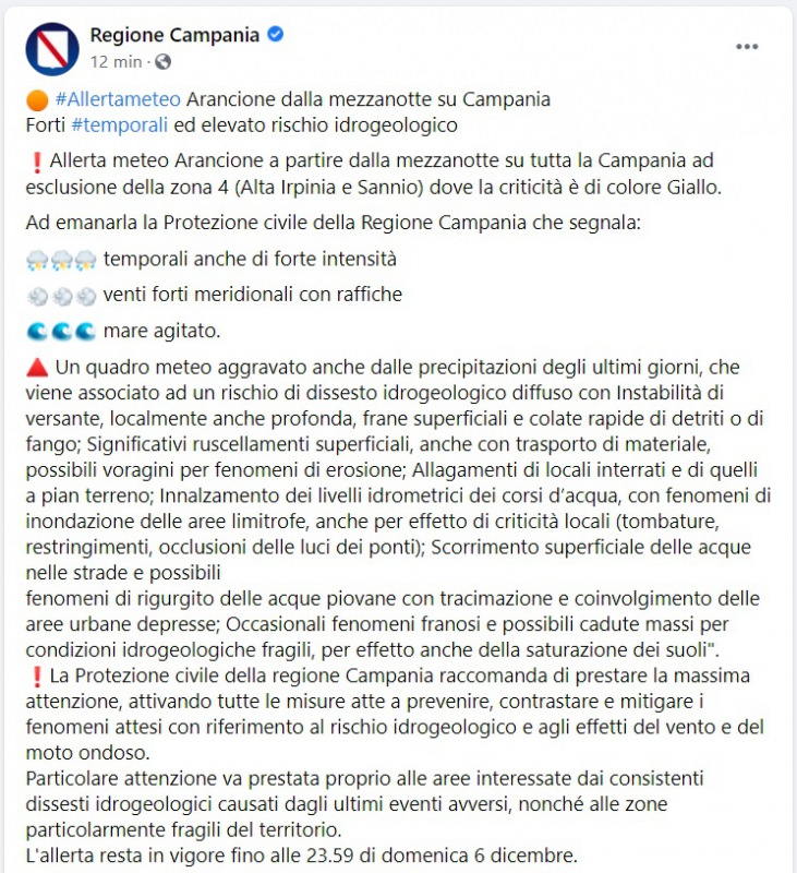 Questo quanto pubblicato sulla pagina fb della Regione Campania