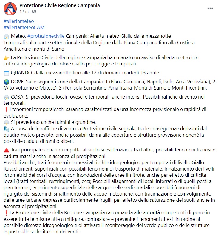 Questo quanto apprendiamo dalla pagina fb della Port. Civile Regione Campania: "Meteo, protezione civile Campania: Allerta meteo Gialla dalla mezzanotte Temporali sulla parte settentrionale della Regione dalla Piana Campana fino alla Costiera Amalfitana e monti di Sarno - si legge nella nota - La Protezione Civile della regione Campania ha emanato un avviso di allerta meteo con criticità idrogeologica di colore Giallo per piogge e temporali. QUANDO: dalla mezzanotte fino alle 12 di domani, martedì 13 aprile. DOVE: Sulle seguenti zone della Campania: 1 (Piana Campana, Napoli, Isole, Area Vesuviana), 2 (Alto Volturno e Matese), 3 (Penisola Sorrentino-Amalfitana, Monti di Sarno e Monti Picentini). COSA: Si prevedono locali rovesci e temporali, anche intensi. Possibili raffiche di vento nei temporali. I fenomeni temporaleschi - si legge nella nota - saranno caratterizzati da una incertezza previsionale e rapidità di evoluzione. Si prevedono anche fulmini e grandine. A causa delle raffiche di vento la Protezione civile segnala, tra le conseguenze derivanti dal quadro meteo previsto, anche possibili danni alle coperture e strutture provvisorie nonché la possibile caduta di rami o alberi. Tra i principali scenari di impatto al suolo si evidenziano, tra l'altro, possibili fenomeni franosi e caduta massi anche in assenza di precipitazioni. Possibili anche, tra i fenomeni connessi al rischio idrogeologico per temporali di livello Giallo - si legge nella nota -: Ruscellamenti superficiali con possibili fenomeni di trasporto di materiale; Innalzamento dei livelli idrometrici dei corsi d’acqua, con inondazioni delle aree limitrofe, anche per effetto di criticità locali (tratti tombati, restringimenti, ecc); Possibili allagamenti di locali interrati e di quelli posti a pian terreno; Scorrimento superficiale delle acque nelle sedi stradali e possibili fenomeni di rigurgito dei sistemi di smaltimento delle acque meteoriche, con tracimazione e coinvolgimento delle aree urbane depresse particolarmente fragili, per effetto della saturazione dei suoli, anche in assenza di precipitazioni. La Protezione civile della Regione Campania raccomanda alle autorità competenti di porre in essere tutte le misure atte a mitigare, contrastare e prevenire i fenomeni attesi - si legge nella nota - in ordine al possibile dissesto idrogeologico e di attivare il monitoraggio del verde publico e delle strutture esposte alle sollecitazioni dei venti."