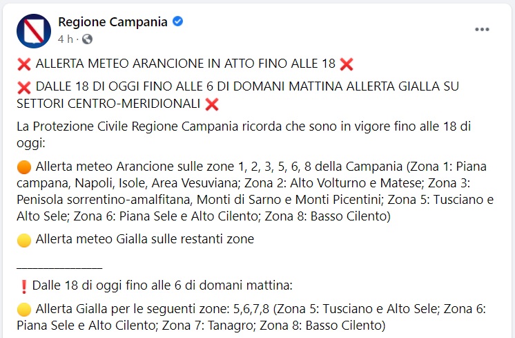 Questo quanto pubblicato sulla pagina fb della Regione Campania
